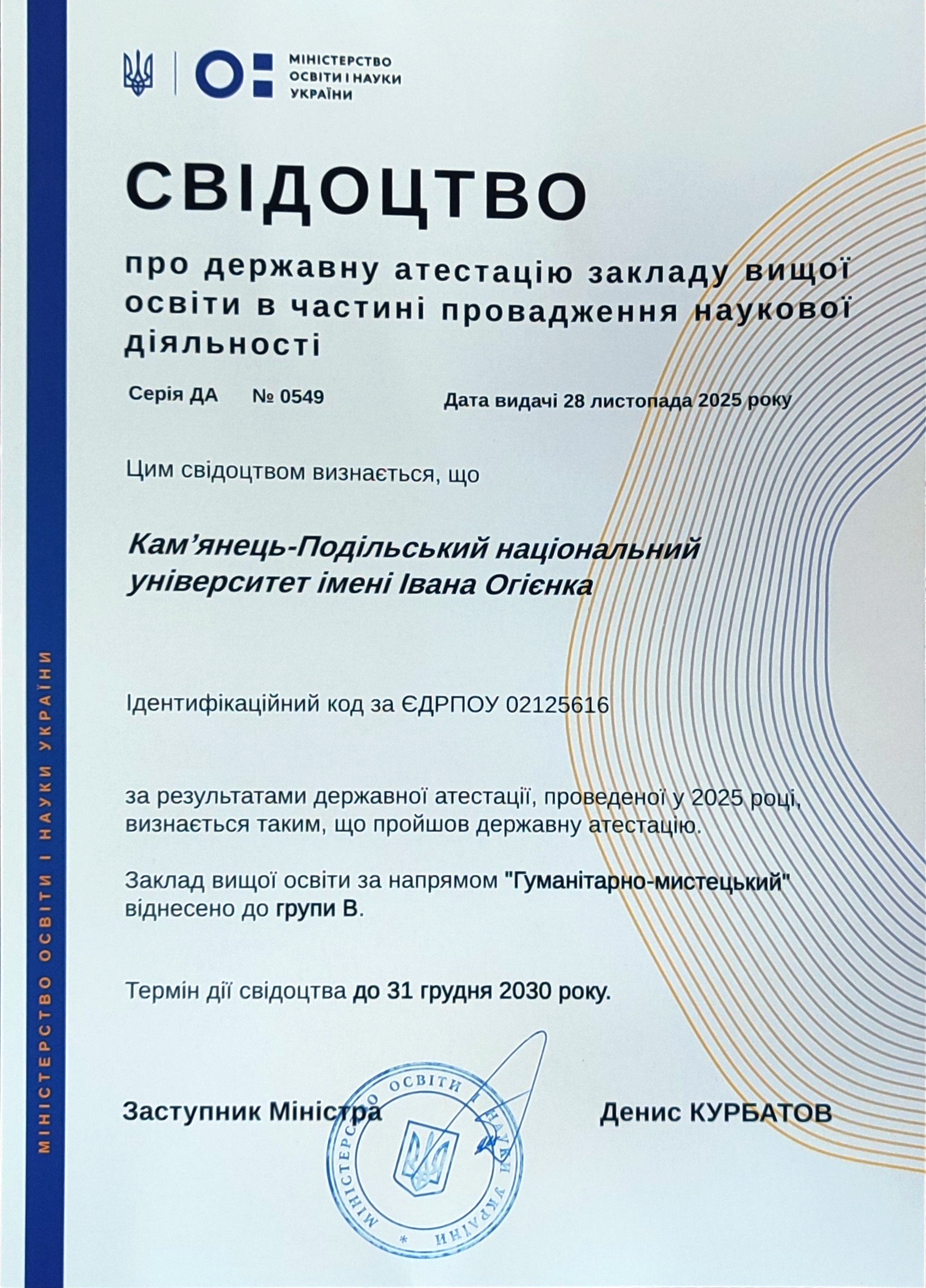 Наукову і науково-технічну діяльність у К-ПНУ здійснюють за п’ятьма напрямами наукової (науково-технічної) діяльності відповідно до Наказу Міністерства освіти і науки України №1485 від 21.10.2024 р. «Про державну атестацію наукових установ та закладів вищої освіти в частині провадження такими закладами наукової (науково-технічної) діяльності».*